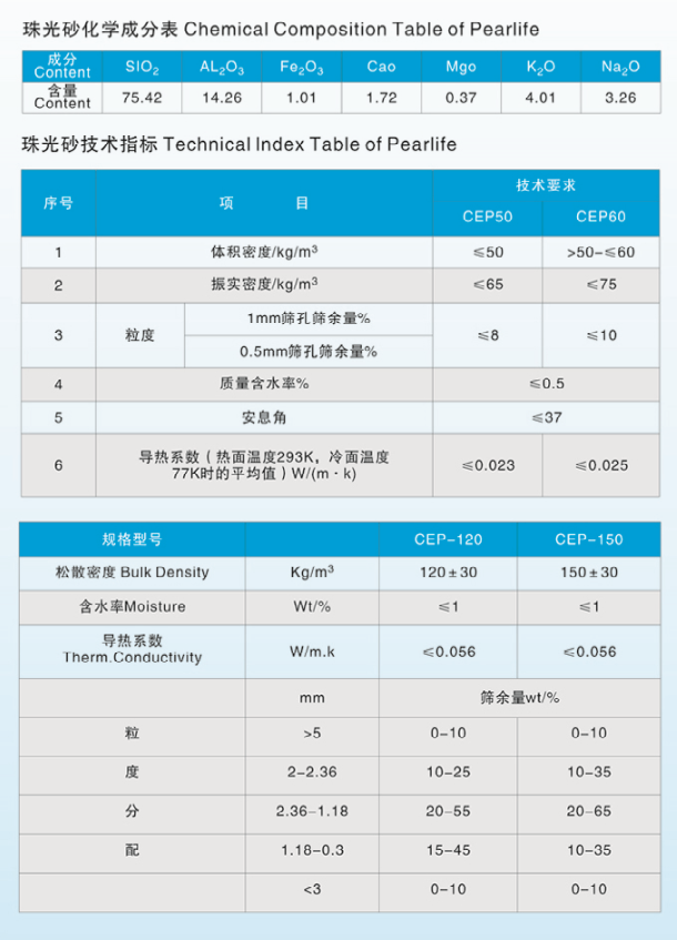 它是由玻璃质山岩经破碎及高温焙烧而成,呈白色圆珠状松散颗粒。无毒、无味、不燃烧、不腐蚀。由于它具有极低的导热性和可靠的化学稳定性、良好的充填流动性和极低的容重性而被广泛应用于工业、农业、国防、环保、化工、饮食、建筑等各个行业。尤其在深冷工程中、空分设备(制氧机冷箱)、储槽、LNG运输船及其他综合工程中具有其他绝热材料所不可替代的卓越性能。